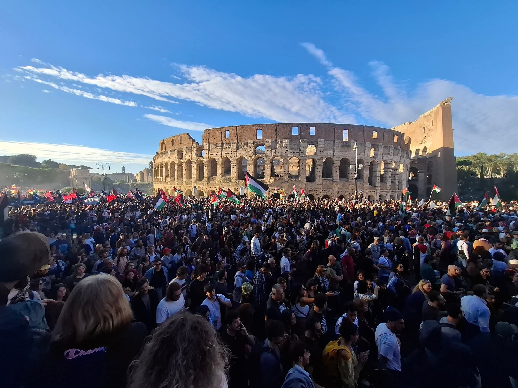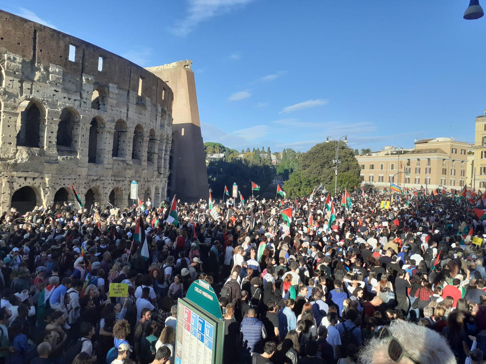 Se la Palestina va dal fiume al mare, oggi nella strade di Roma c’era un fiume umano ininterrotto da Porta San Paolo passando per il Colosseo fino a Piazza San Giovanni per la Palestina. che è diventato mare, un mare di indignazione contro il genocidio e un governo che se ne è reso complice.