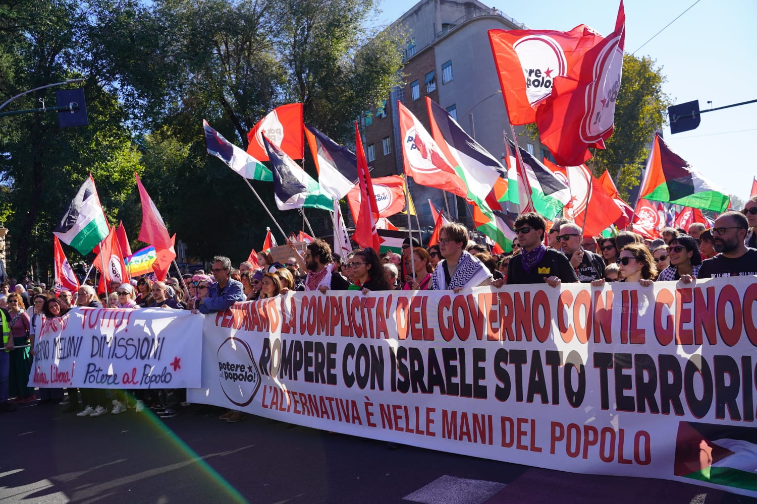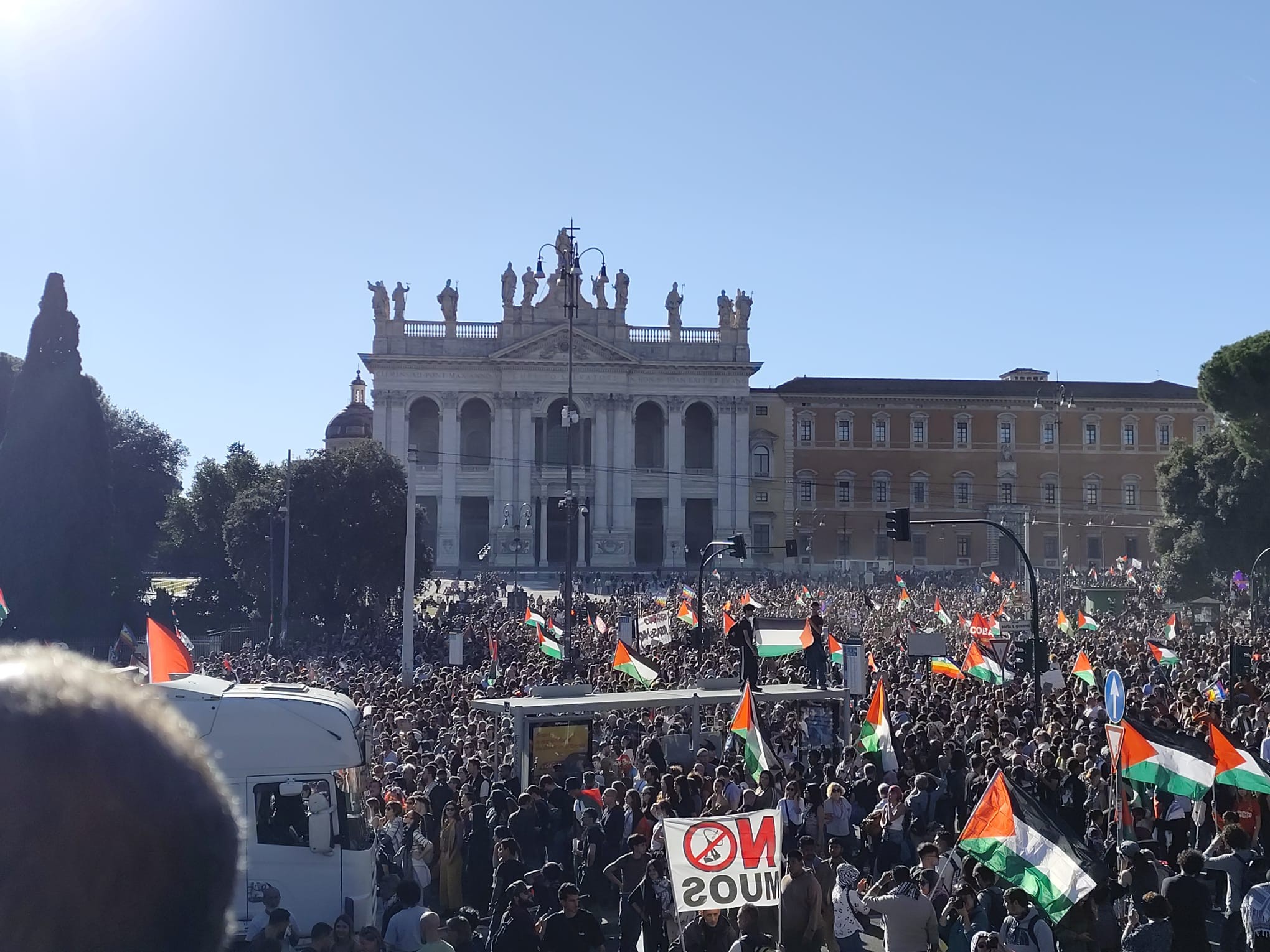 La manifestazione nazionale per la Palestina, per fermare il genocidio del popolo palestinese a Gaza e fermare il progetto sionista con la resistenza è diventata ben presto una marea incalcolabile che straripa su ogni metro di strada che da Porta San Paolo porta verso Piazza san Giovanni dove sono previsti gli interventi finali del corteo.