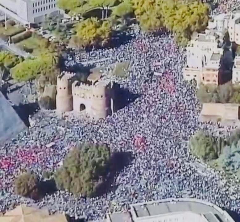All’altezza di piazza Albania il corteo straripa addirittura su tre corsie, ma nella piazza di partenza ci sono ancora migliaia di persone che non riescono a partire. Si capisce allora che le persone venute a manifestare a Roma sono centinaia di migliaia, anche se la polizia ha creato “imbuti” per rallentare l’afflusso ai caselli delle autostrade o ha dirottato alcuni pullman per non farli arrivare a destinazione.