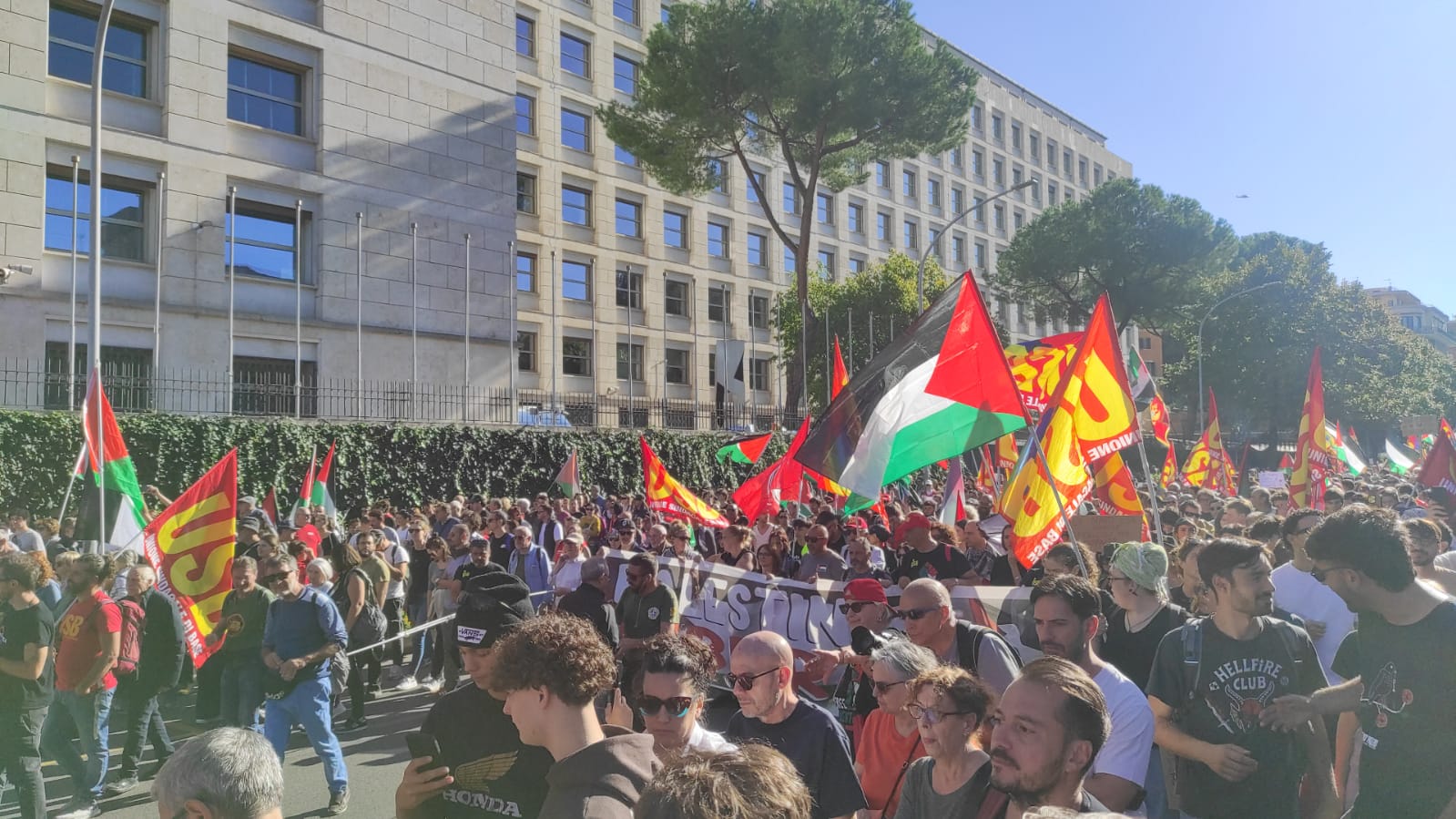 La manifestazione è aperta dalle associazioni palestinesi, con tantissimi ragazzi di seconda generazione, poi i sindacati base, e via via innumerevoli spezzoni e striscioni. Ma la gente è talmente tanta che il corteo deve procedere su due corsie su viale Aventino. Gli slogan che si sentono con maggiore sono “Meloni e Salvini assassini”, “Palestina libera”, “Siamo tutti antifascisti/antisionisti”