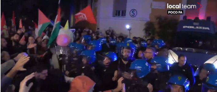 Questo fatto gravissimo, che segna aumento del livello repressivo, dimostra non solo, ancora una volta, la complicità del governo con lo stato terrorista d’Israele e con il sionismo, ma il totale restringimento degli spazi di democrazia e l’atteggiamento vergognoso del governo Meloni, fascista nella gestione del dissenso, con il dl sicurezza e il ddl Gasparri, un governo di cui pretendiamo le dimissioni immediate che agisce in questo modo perché ha paura delle mobilitazioni immense delle settimane passate e vuole nascondere le proprie complicità con il genocidio.