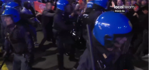 I manifestanti, praticamente circondati, ad un certo punto si sono seduti per terra. La situazione si è alla fine sbloccata consentendo il deflusso ma lo hanno dovuto fare sotto i colpi d’acqua sparati da un idrante.