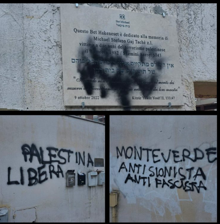 Il mattino successivo è giunta la notizia che durante la notte due sconosciuti col volto travisato, ripresi dalle telecamere di sorveglianza, come scrivono le cronache, avevano vigliaccamente imbrattato con una bomboletta spray la lapide di Stefano Gaj Taché, posta all’ingresso della sinagoga del quartiere, da dove erano usciti nelle settimane precedenti gli aggressori degli studenti del Caravillani.