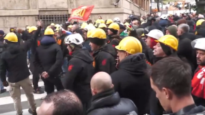 I lavoratori hanno raggiunto largo Lanfranco dove la polizia aveva posizionato una grata per impedirgli l’accesso alla Prefettura. Decine di operai hanno iniziato a sbattere e lanciare i caschetti al grido di “lavoro, lavoro”.