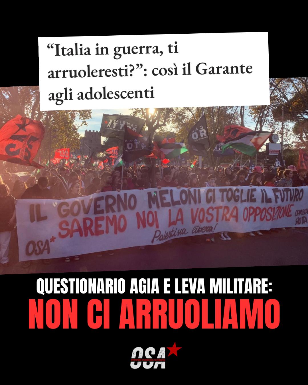 Il questionario Agia è uno schifo, non saremo braccia per la guerra voluta da governo Meloni e Occidente