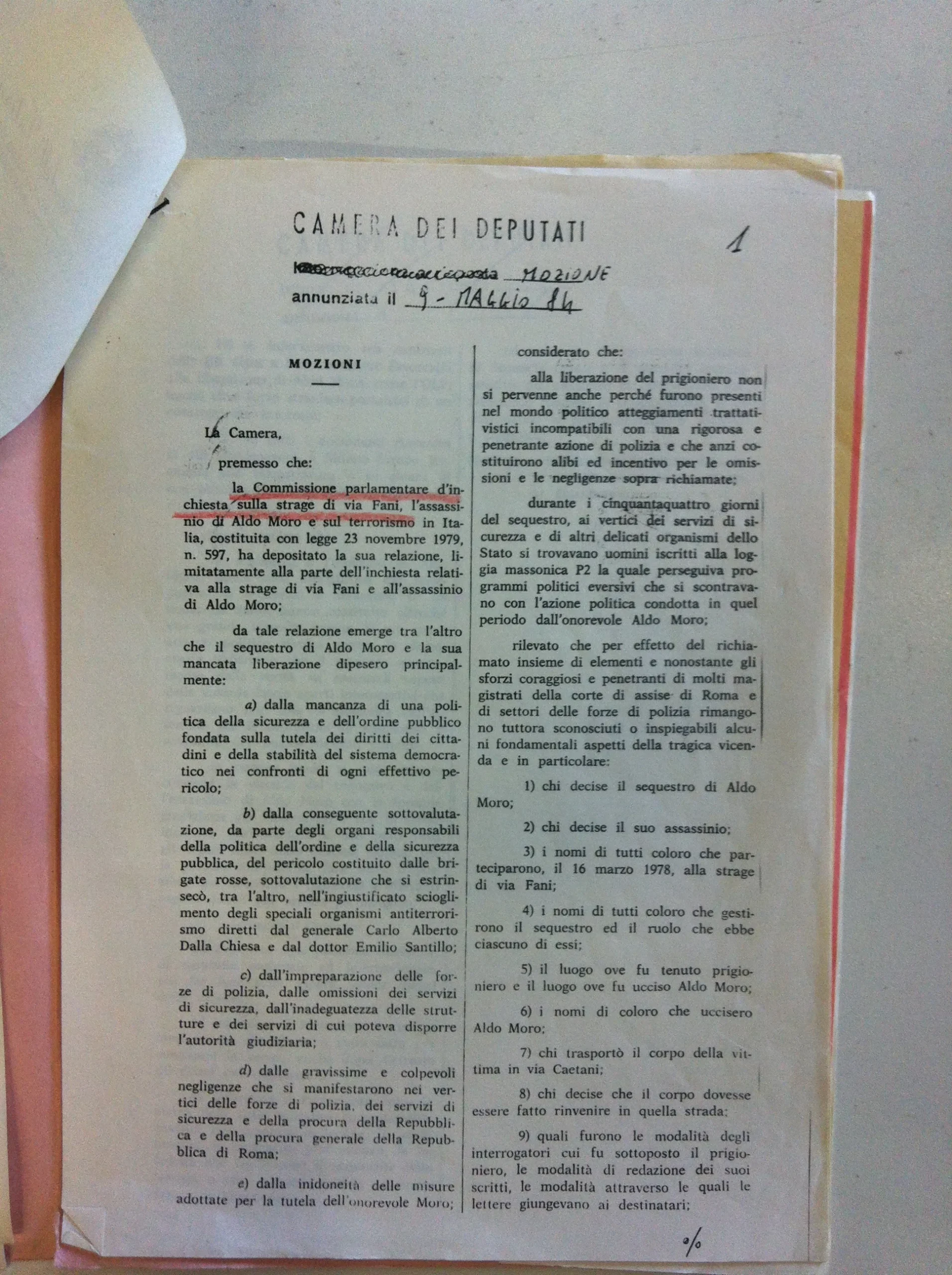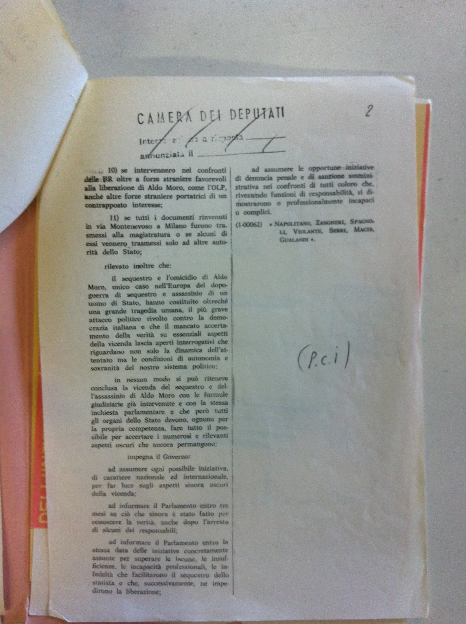 In crisi di strategia dopo il naufragio del compromesso storico e la morte prematura del segretario, il Pci impresse una svolta anche sul sequestro dello statista democristiano con la mozione presentata il 9 maggio 1984 alla Camera e al Senato dai capigruppo Chiaromonte e Napolitano, a firma rispettivamente dei senatori Pecchioli, Tedesco, Tatò e Flamigni e dei deputati Zangheri, Spagnoli, Violante, Serri, Macis e Gualandi.