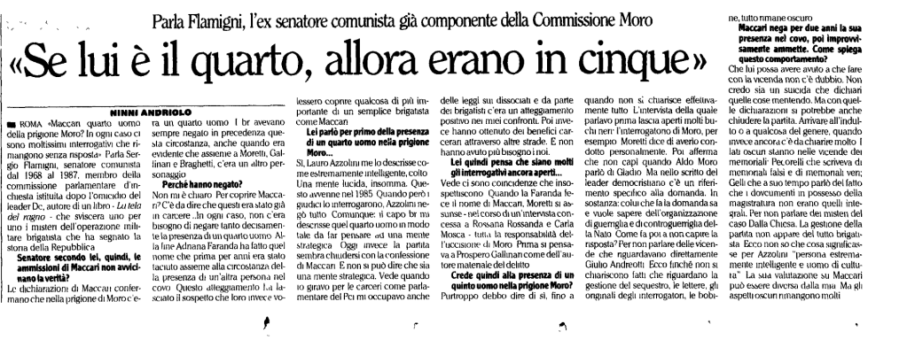 Passa sistematicamente al setaccio tutti i proprietari degli appartamenti situati nelle strade che hanno interessato il sequestro, per denunciare i loro nomi quando si tratta di persone ai suoi occhi sospette, ma dimentica di rivelare che accanto al civico 8 di via Montalcini abitava il senatore Giuseppe D’Alema, padre di Massimo. Calunnia Balzerani e Moretti, sostenendo che sono loro ad aver fatto il nome di Maccari, evitando di citare la confessione della Faranda.