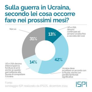 In linea con i risultati dello scorso anno, sulla guerra in Ucraina si conferma una posizione netta contraria a farsi coinvolgere in una guerra per Kiev. Quasi la metà degli italiani (49%) desidera infatti la fine delle ostilità nel più breve tempo possibile. Tra questi, una larga maggioranza sarebbe disposta ad accettare compromessi significativi: tre su quattro (36% del totale) ritengono auspicabile che Kiev accetti un accordo con Mosca anche a costo di rilevanti concessioni territoriali.