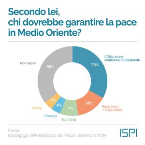 Nella gestione del processo di pace in Medio Oriente, solo il 4% ritiene che l’Europa possa garantire la pace nella regione, una quota sostanzialmente identica a quella di Israele e nettamente inferiore a quella riservata agli Stati Uniti (9%).