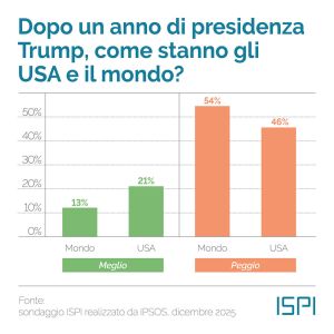 Secondo gli italiani, l’elezione di Trump non ha prodotto benefici nemmeno per il suo Paese: il 46% ritiene che le cose negli USA vadano peggio, più del doppio di quanti pensano vadano meglio (21%).