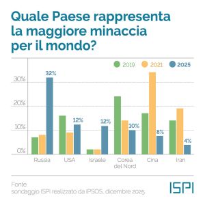 Per il quarto anno consecutivo, una maggioranza relativa di italiani indica nella Russia la principale minaccia per la sicurezza globale (32%). Nel 2019 al primo posto era arrivata la Corea del Nord (24%), seguita a stretto giro da Cina, USA e Iran. Nel 2021, l’anno precedente l’intervento militare russo in Ucraina, le minacce principali percepite erano la Cina (34%) e l’Iran (19%).