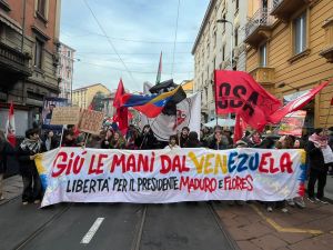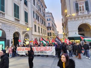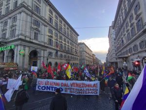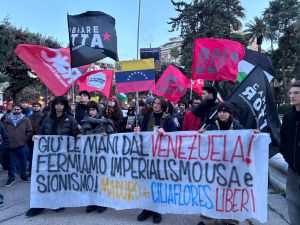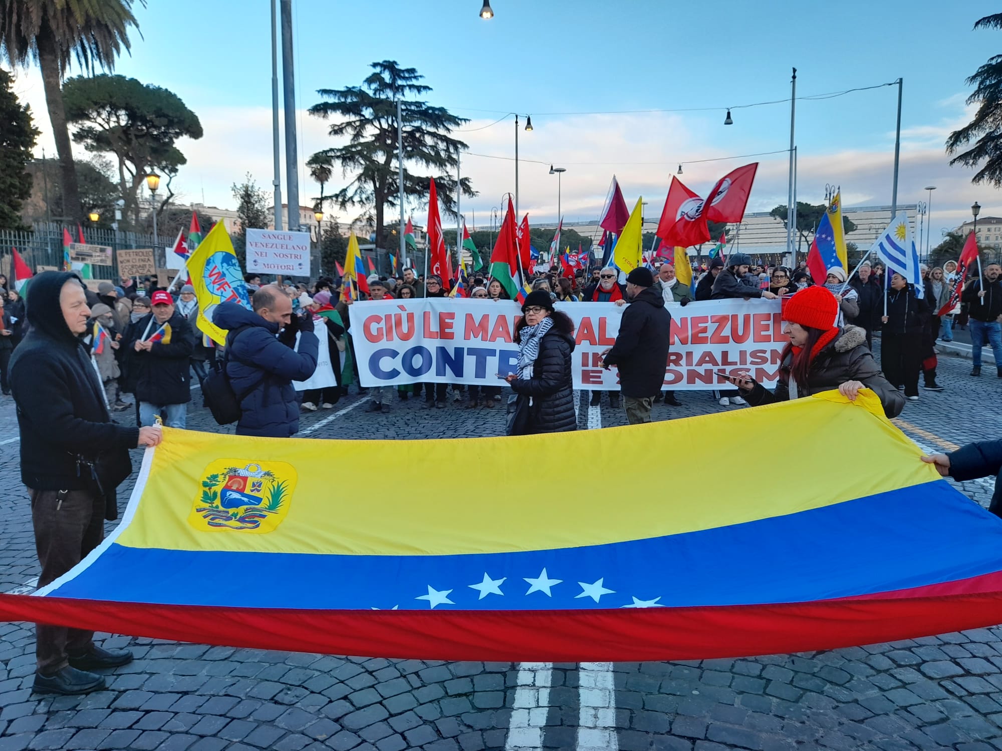 Si è svolta in una trentina di città italiane la giornata nazionale di mobilitazione “Giù le mani dal Venezuela” che ha visto cortei e presidi in piazza contro l’aggressione statunitense e per la liberazione del presidente Nicolas Maduro e di Cilia Flores. Ma nelle manifestazioni sono state ben visibili ovunque le bandiere palestinesi e striscioni che richiamano la comune resistenza dei popoli contro imperialismo e colonialismo.