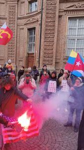 Anche a Torino alla partenza del corteo è stata bruciata una bandiera statunitense, dopo una tappa davanti alla sede Rai, il corteo è arrivato sotto la Questura dove anche qui, come a Roma, è intervenuto telefonicamente il figlio del Presidente Maduro.