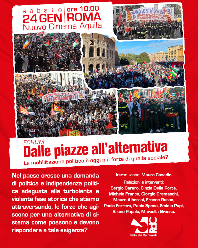 Come devono interagire con questo cambio di passo i comunisti e le forze di classe che evocano una alternativa sistemica? E’ questo il tema di confronto intorno a cui ruoterà il Forum “Dalle piazze all’alternativa” organizzato a Roma per sabato 24 gennaio dalla Rete dei Comunisti.