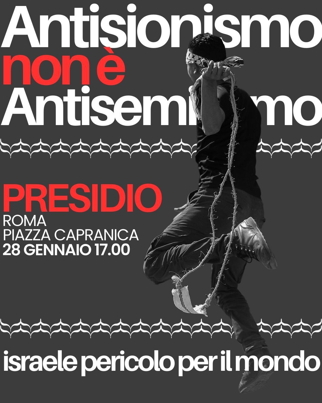 In concomitanza con l’avvio della discussione al Senato di un provvedimento per l’equiparazione tra antisionismo e antisemitismo e la messa al bando del diritto di critica dell’operato genocida dello stato di Israele, Roma scende di nuovo in piazza contro l’ennesima iniziativa repressiva: il 28 gennaio, alle ore 17, piazza Capranica (sotto Montecitorio) vedrà in strada chi si dichiara “orgogliosamente antisionista” e solidale con il popolo palestinese.