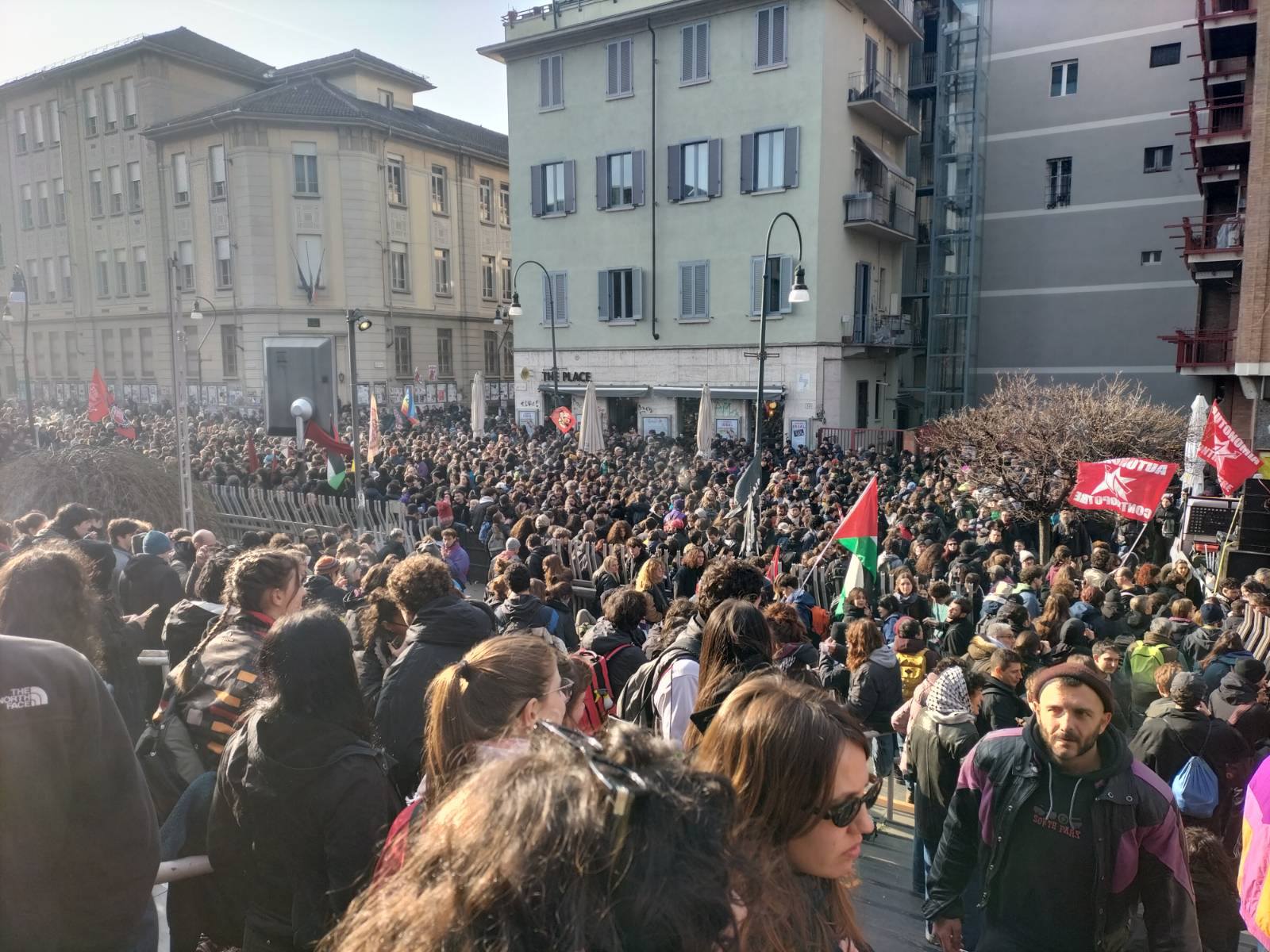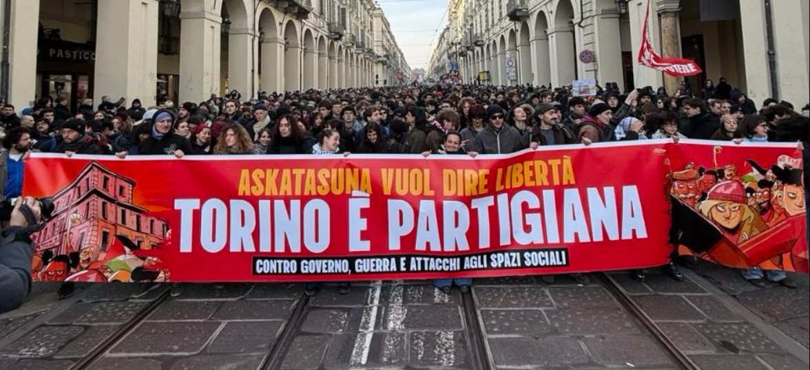 Ad ogni modo, tornando alla manifestazione, i tre cortei si sono mossi in contemporanea verso Piazza Vittorio, dove si sono ricongiunti dietro lo striscione “Askatasuna vuol dire libertà. Torino è partigiana. Contro governo, guerra e attacchi agli spazi sociali”. Parole d’ordine chiare rispetto alle responsabilità politiche di uno sgombero, quello del centro sociale torinese, che è solo un tassello di una deriva più generale di guerra, esterna e interna.