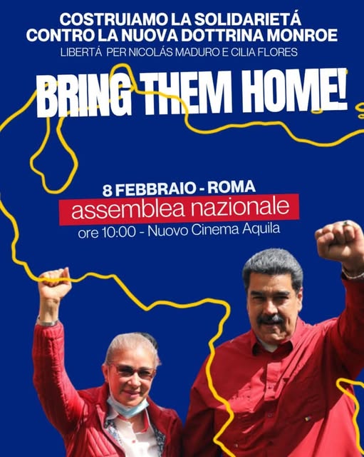 L’assemblea, che sta allargando le adesioni ben oltre i promotori iniziali, è un primo momento di riflessione collettiva che parte dall’esplicita richiesta della liberazione del Presidente della Repubblica Bolivariana del Venezuela, Nicolás Maduro, e della “Prima Combattente” Cilia Flores, mettendo al centro la necessità di costruzione della solidarietà internazionalista contro la “Nuova Dottrina Monroe” statunitense, o “Don Row” come l’ha ribattezzata – con la sua solita megalomania – l’attuale presidente degli USA.