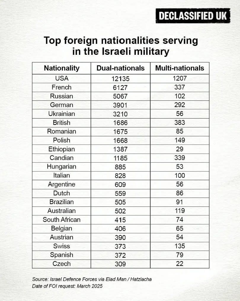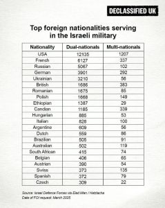 Migliaia di britannici, americani, francesi, italiani, russi, tedeschi e ucraini con doppio passaporto fanno parte dell’esercito israeliano. Una ricerca di Declassified UK ha rilevato che oltre 50.000 soldati israeliani hanno la cittadinanza di Israele e di almeno un altro Paese.