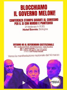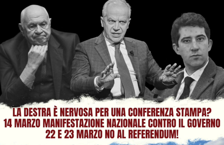Dopo le grandi manifestazioni e scioperi dell’autunno, la mobilitazione di un’area politica e sociale indipendente dalla destra e dal “campo largo” continua a innervosire il governo, per questo confermiamo la conferenza stampa alle ore 11:30 all’incrocio tra Via San Donato e Via del Pilastro, rilanciamo la manifestazione nazionale del 14 marzo e il NO al referendum del 22 e 23 marzo!