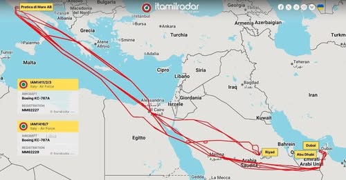 “Il tracciato delle rotte dei voli degli ultimi due giorni mostra un consistente movimento a navetta operato da due aerei cisterna KC-767A”, scrive ItaMilRadar. “Fin dall’inizio della settimana, l’aereo aveva effettuato diversi viaggi di andata e ritorno da Pratica di Mare a diverse destinazioni del Golfo Persico, principalmente Riyadh, Dubai ed Abu Dhabi. La flotta degli aerei KC-767A dell’Aeronautica italiana è normalmente impiegata per missioni di rifornimento in volo e trasporto strategico. Tuttavia, oltre alle operazioni di rifornimento di carburante, questo aereo può trasportare anche passeggeri e carichi vari, rendendolo adatto per la movimentazione rapida del personale durante situazioni di emergenza”.