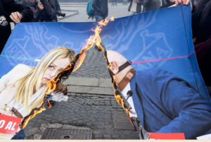 Durante il corteo sono state bruciate le immagini del ministro Nordio e della Meloni, quelle di Trump e Netanyahu e una bandiera statunitense. Stizzite le reazioni della destra e del governo ma anche quelle di Giuseppe Conte e dell’Anm. La Digos fa sapere che denuncerà gli autori per vilipendio.