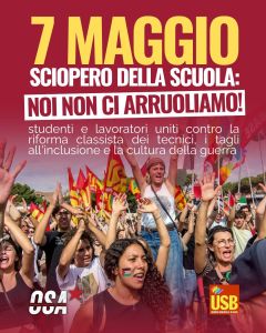 “Sciopereremo insieme perché abbiamo un unico progetto: una scuola diversa da quella che il sistema capitalista in crisi ci sta imponendo” – scrivono OSA (Opposizione Studentesca d’Alternativa) e Usb Scuola in un comunicato congiunto – “Rifiutiamo la scuola messa al servizio della guerra e dei privati e vogliamo costruire una risposta collettiva all’altezza della fase storica. Sciopereremo contro la militarizzazione della scuola e della società, contro la leva obbligatoria, contro la riforma degli istituti tecnici e professionali che consegna la formazione delle classi popolari direttamente nelle mani delle imprese e contro un rinnovo contrattuale che offre salari vergognosi in una fase in cui l’inflazione è destinata a crescere, trascinata dai costi di guerre che non abbiamo voluto e non vogliamo”.