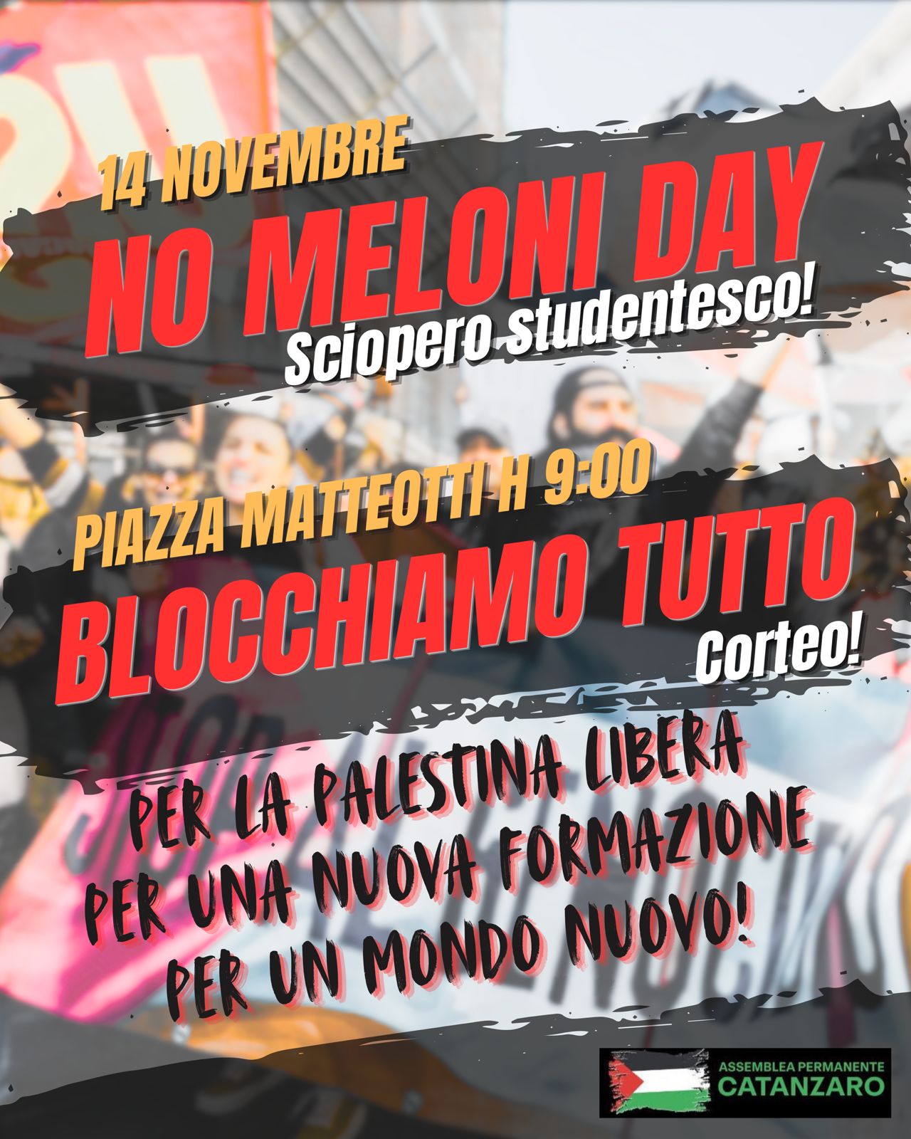 Il Governo Meloni non ci rappresenta, ha perso ogni credibilità politica, lasciandoci nella crisi in cui siamo, ed etica, sostenendo Israele e le guerre. Se non vogliono sentire il dissenso se ne faranno una ragione: il 14 novembre svuoteremo le scuole e gli atenei per un grande sciopero studentesco che sfiducia il governo, il 14 novembre sarà #NOMELONIDAY per dire no alle politiche del governo e sì a una Nuova Formazione Pubblica, alla Palestina Libera, a un Mondo Nuovo.