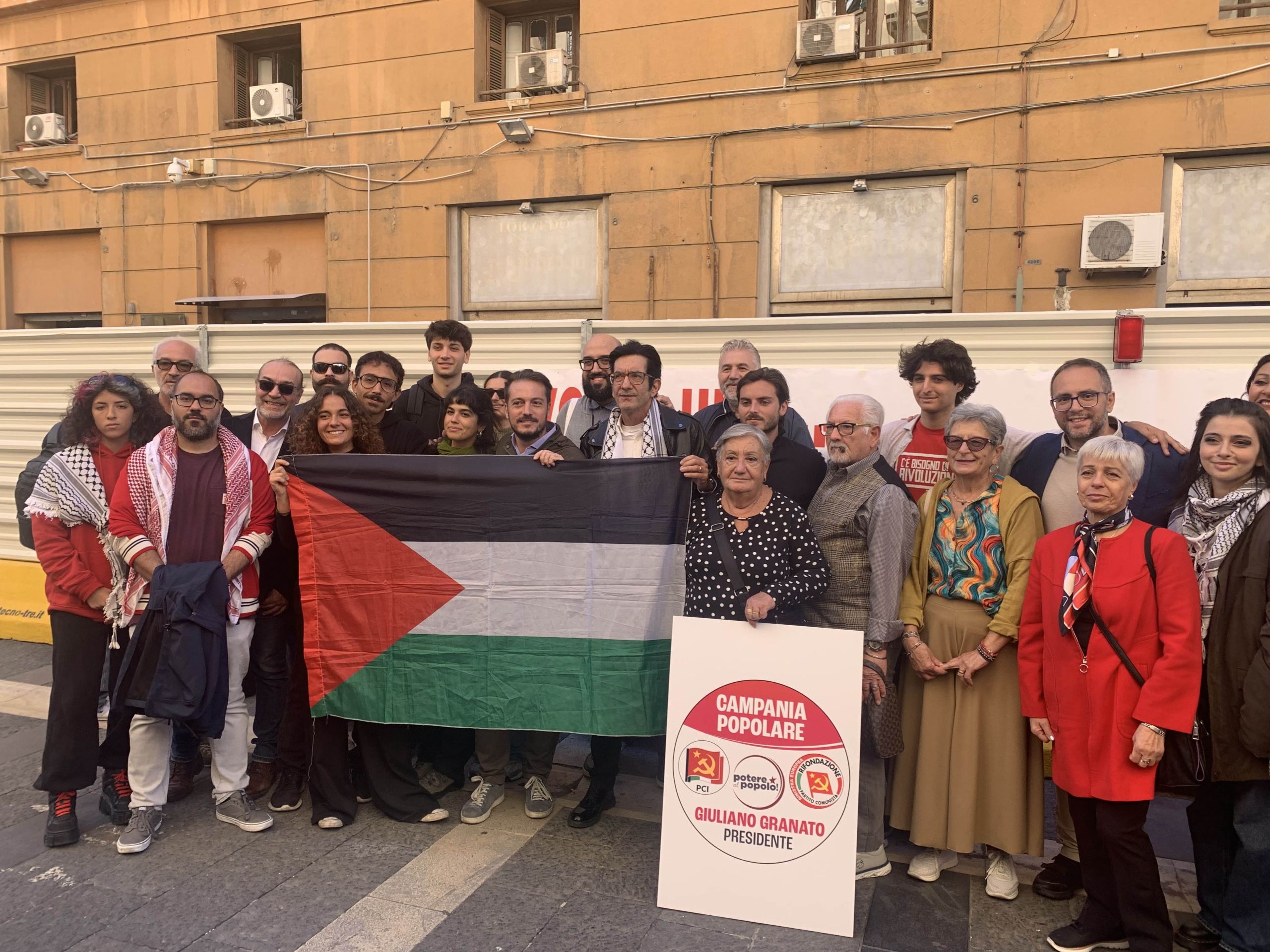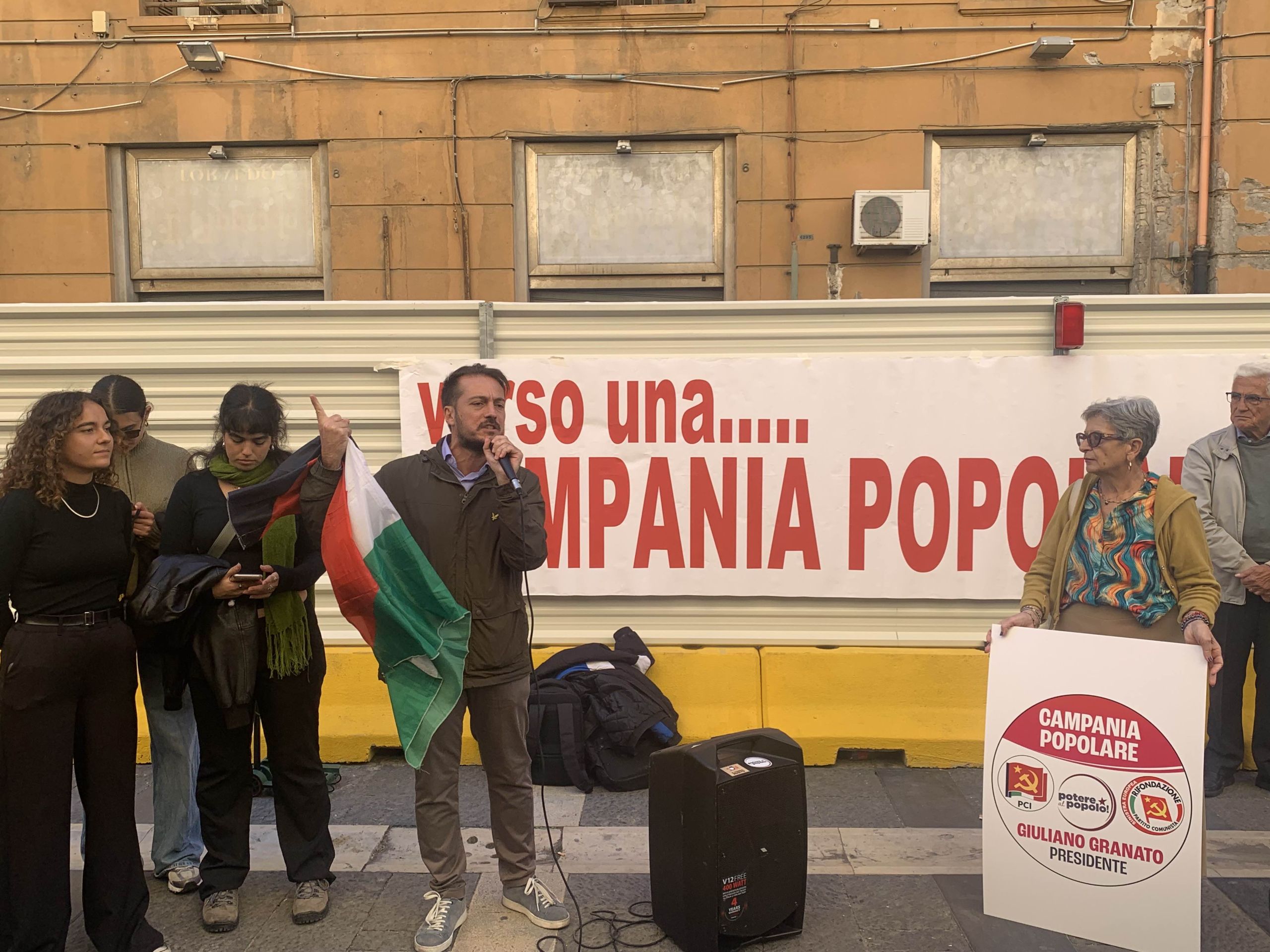A prendere la parola Giuliano Granato, portavoce nazionale di Potere al Popolo e candidato alla presidenza della Regione, affiancato da Pietro D’Alise per il PCI, Elena Coccia per Rifondazione Comunista e Paolo Bordino, candidato nel collegio salernitano. L’iniziativa ha visto la partecipazione di numerosi giovani, militanti e cittadini, e si è svolta in un clima ancora di forte coinvolgimento per le meravigliose manifestazioni popolari degli ultimi giorni, vi è infatti una bandiera palestinese, a testimonianza della grande empatia per il martoriato popolo gazawo .