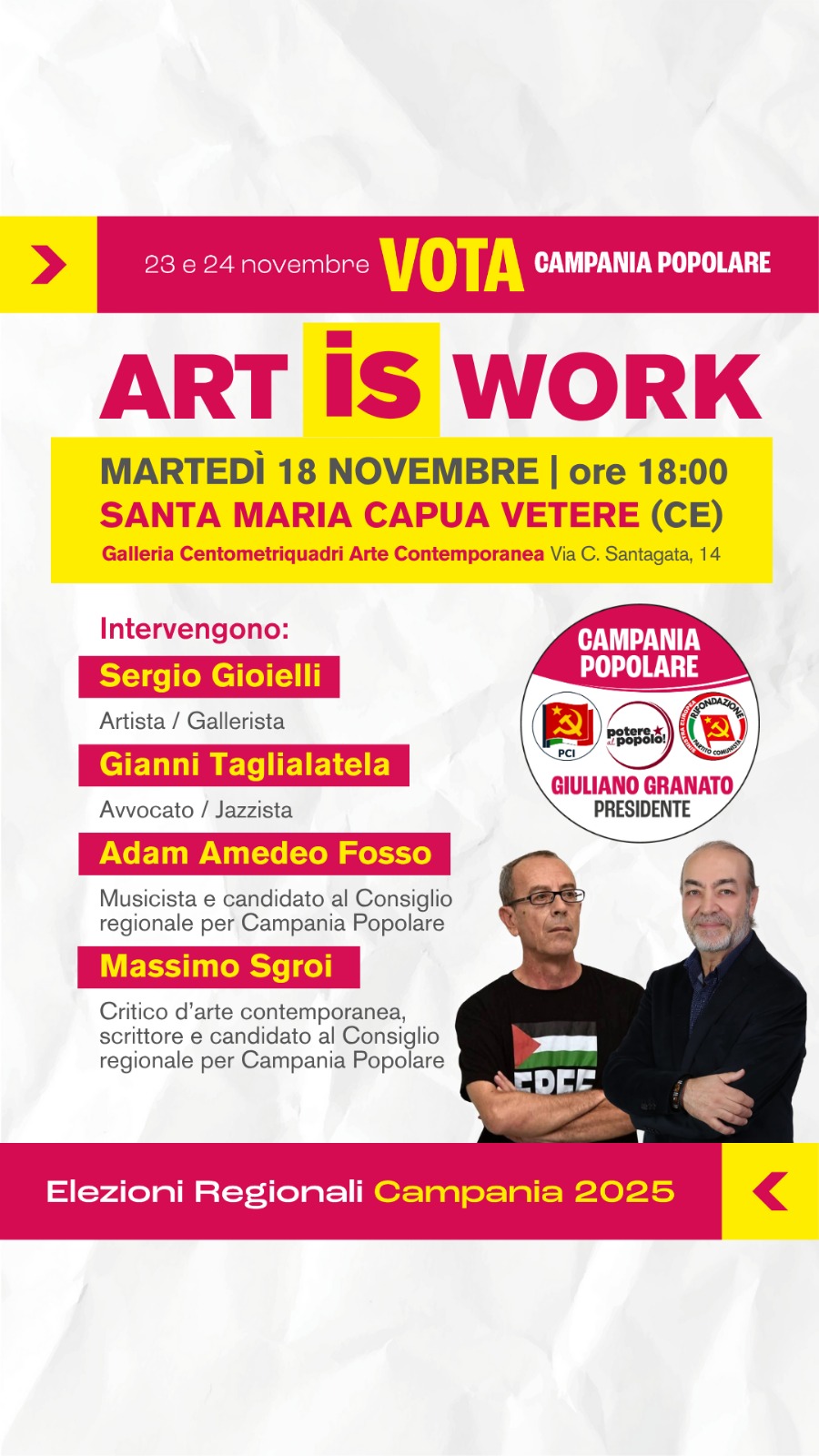Per questo motivo noi di Campania Popolare delegheremo chiunque di noi sia eletto nel consiglio regionale della Campania alla presentazione di una legge regionale che ristabilisca i diritti degli artisti e dei lavoratori del mondo della cultura.