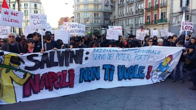 Nel 2017 la Lega di Salvini –che fino al giorno prima definiva il Sud una palla al piede apostrofando i napoletani come “parassiti”– viene scortata dalle istituzioni per fare campagna elettorale in Campania.