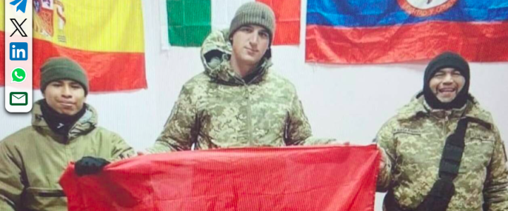 Questo foreign fighter sta facendo una specie di tour delle città emiliane ed è appena stato anche a Piacenza, dove sulla locandina compare addirittura il simbolo della legione volontari stranieri del battaglione ultranazionalista Azov, responsabile di crimini atroci proprio a Mariupol tra il 2014 ed il 2022.