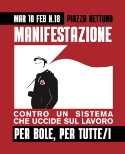 Martedi 10 febbraio a Bologna è stata convocata una manifestazione alle ore 18.00 in piazza Nettuno. Una giornata di lotta contro gli omicidi sul lavoro che ricorderà anche Andrea Bolelli, il nostro “Bole” morto sul lavoro pochi giorni fa.