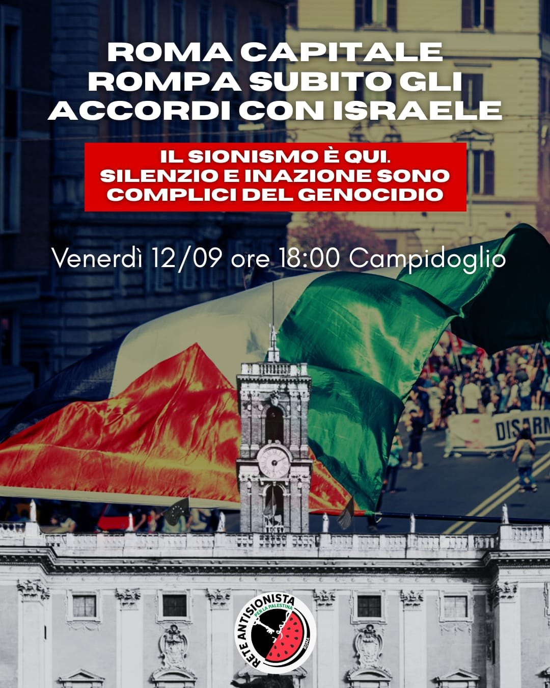 Ultima modifica: stampa- Home / Locali / Lazio / Roma Capitale rompa subito gli accordi con Israele. Venerdi 12 appuntamento in Campidoglio /