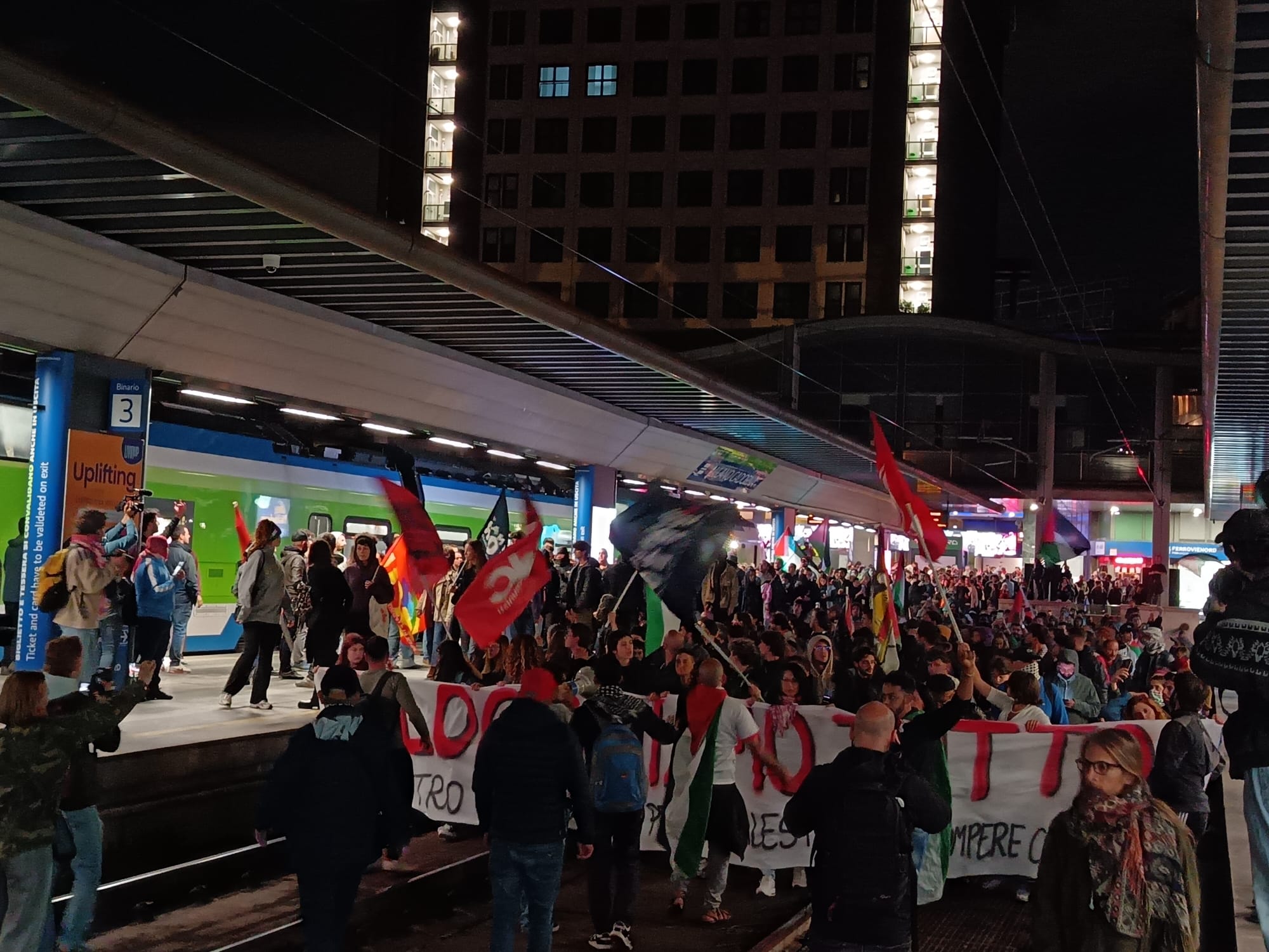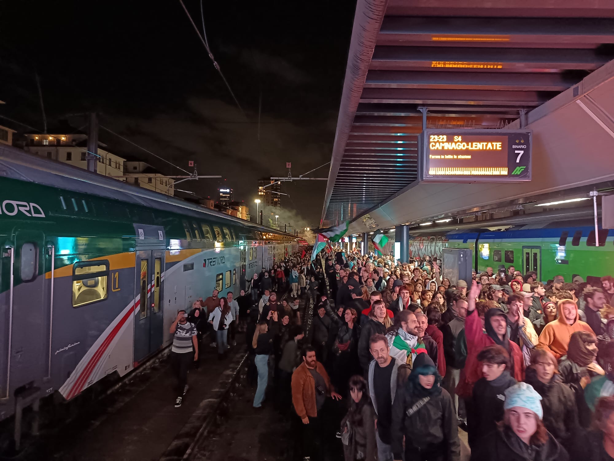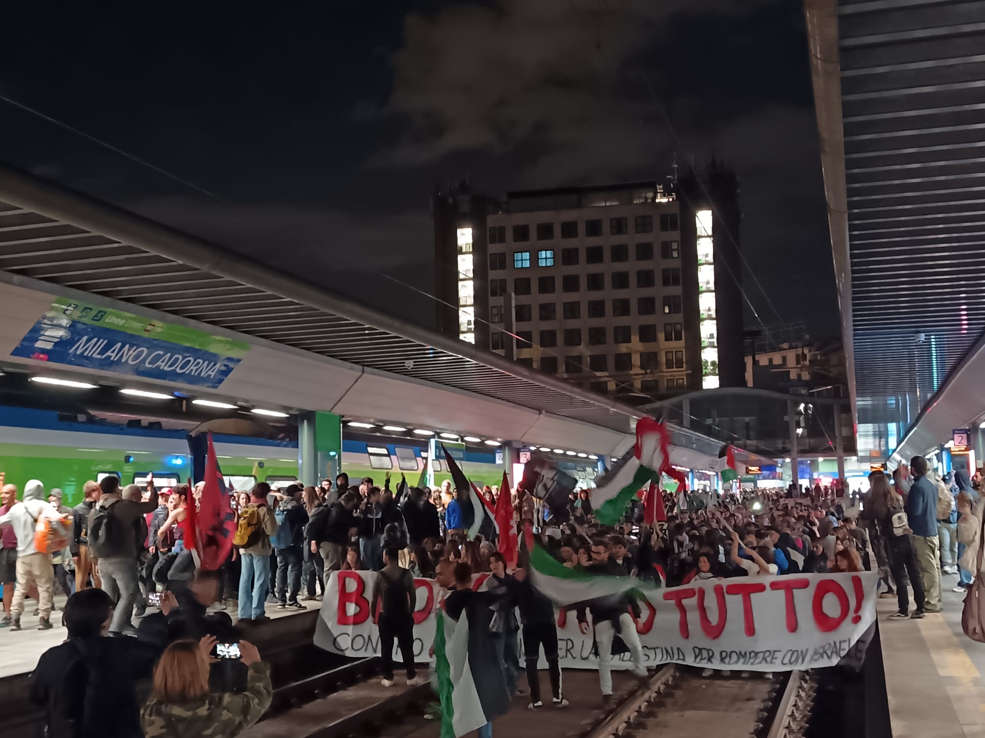 Una volta a Cadorna il corteo, ormai più che raddoppiato e arrivato a quasi 10.000 persone, in maniera ordinata e compatta si è avvicinato all’ingresso della stazione ed è entrato, prendendo i binari tra cori e interventi, percorrendo tutta la lunghezza delle banchine e bloccando interamente il traffico ferroviario. Un risultato straordinario, considerando che il 22 settembre la manifestazione si era conclusa con ore di scontri alla Stazione Centrale, quando la questura di Milano a differenza che nel resto d’Italia, aveva messo in campo un’operazione di blocco frontale e totale alle oltre 6.000 persone che chiedevano di entrare.