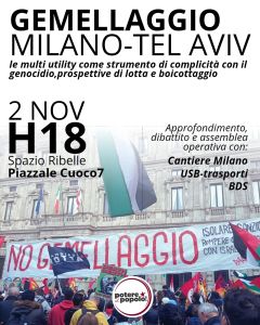 Raccogliendo spunti, considerazioni e proposte dell’assemblea di Piazza Gaza (Ex della Scala) dello scorso 18 ottobre, una delle 100 assemblee permanenti convocate in tutta Italia, il 2 novembre alle 18 allo Spazio Ribelle (Piazzale Cuoco 7) è stato convocato un momento di dibattito e approfondimento sugli strumenti concreti con cui il comune di Milano costruisce e porta avanti i suoi rapporti economici e politici con lo stato genocida.
