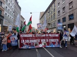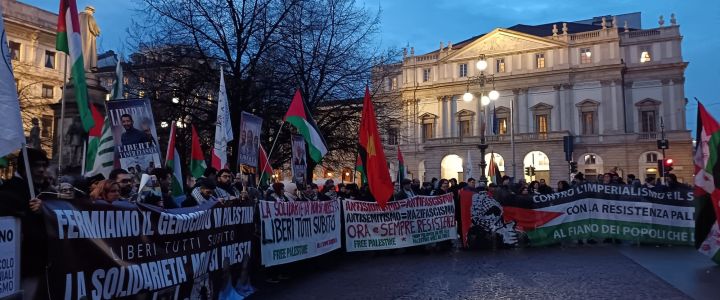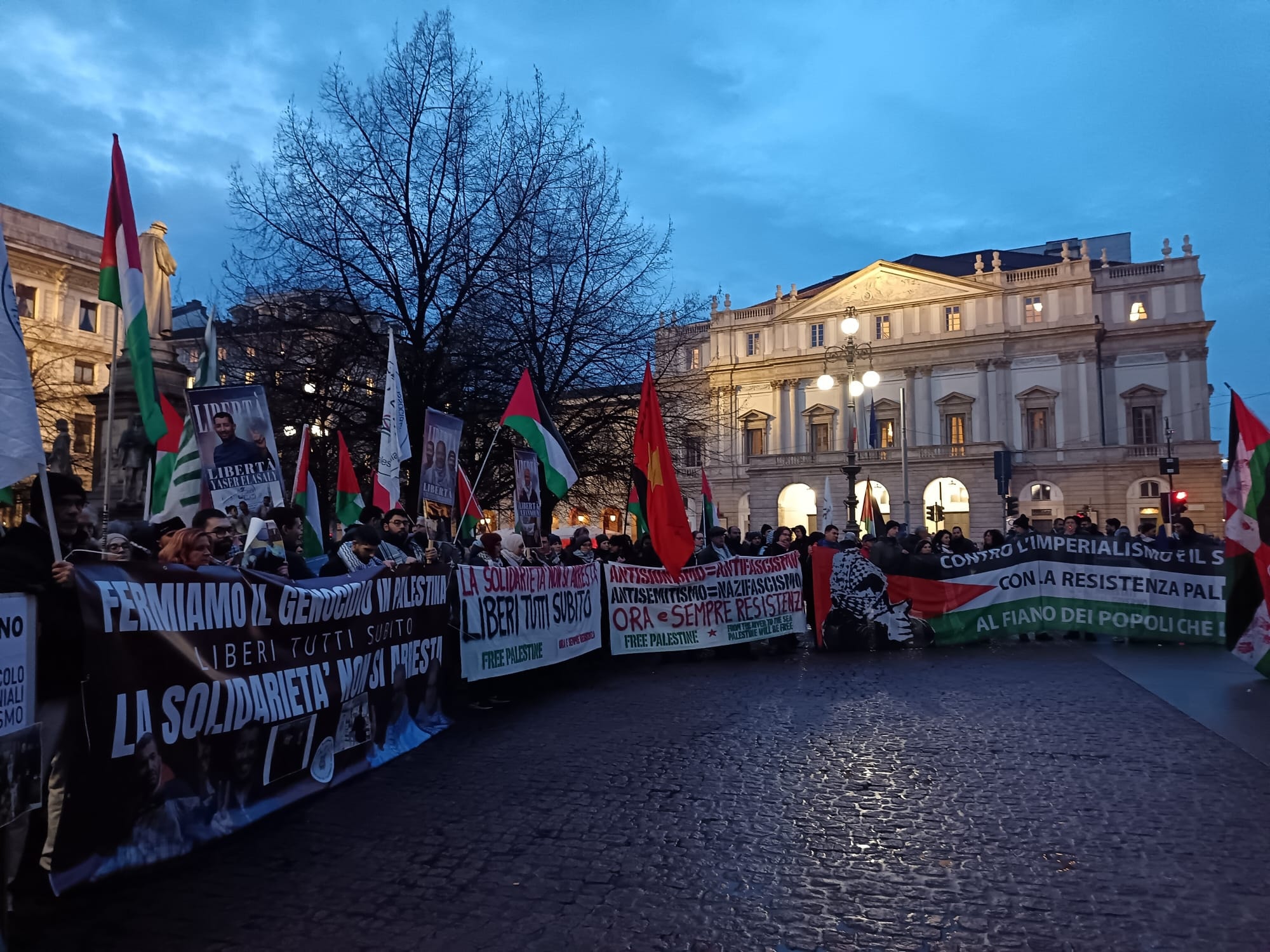 Oggi pomeriggio ancora in un sabato a Milano si è scesi ancora una volta in piazza al fianco dei compagni palestinesi arrestati in Italia e della resistenza palestinese. Il corteo si è concluso in Piazza della Scala, ribattezzata da mesi Piazza Gaza.