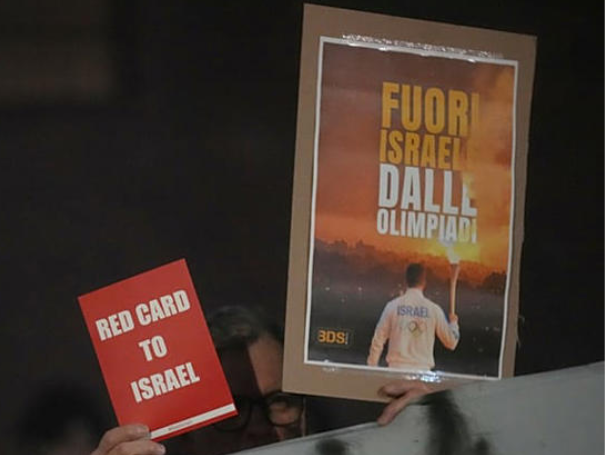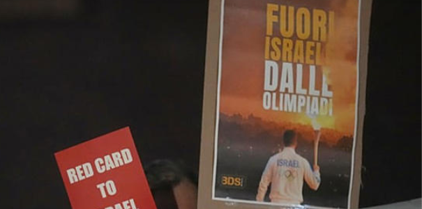 I manifestanti hanno denunciato che se agli atleti russi non è permesso sfilare sotto la propria bandiera a causa dell’invasione dell’Ucraina, allora nemmeno agli israeliani dovrebbe essere permesso di farlo.