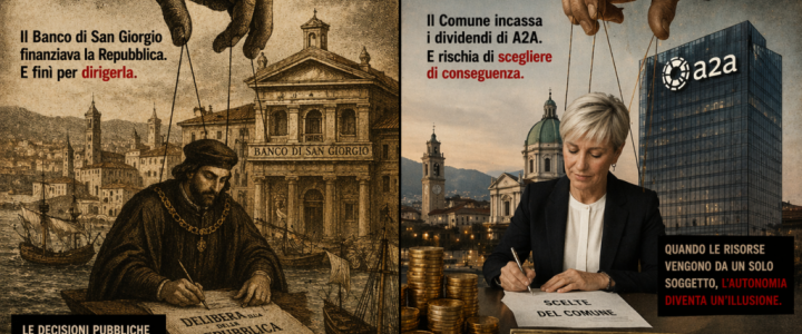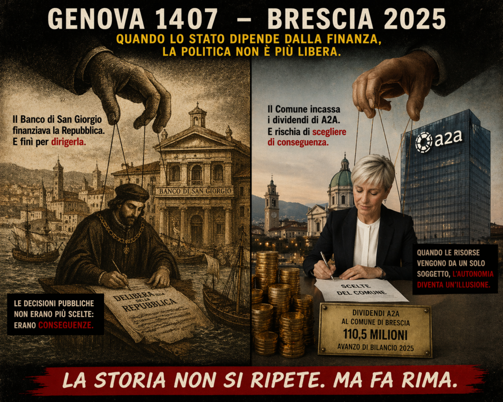 Tra XV e XVIII secolo la Repubblica di Genova finì per dipendere dal Banco di San Giorgio. Non era solo una questione economica, ma politica: lo Stato si piegava alla propria fonte di finanziamento. Oggi Brescia rischia qualcosa di simile.