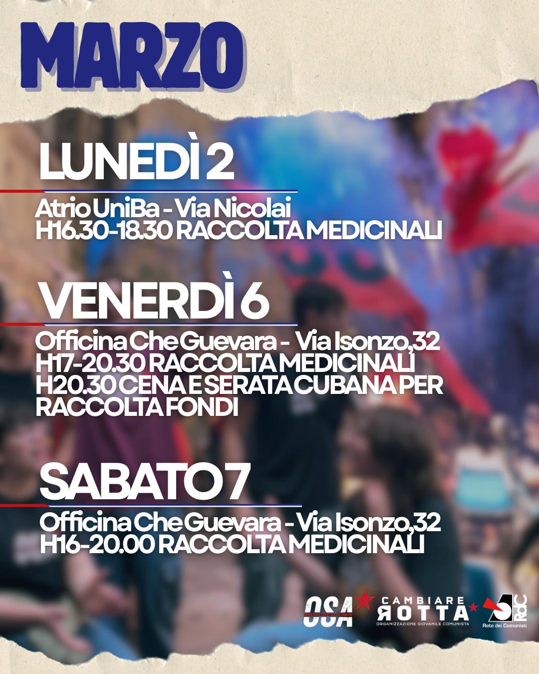 I luoghi dove potrete trovare i compagni sono l’atrio dell’Università di Bari e l’Officina Che Guevara. Oggi e domani, accanto alla raccolta medicinali, è stato organizzato rispettivamente un aperitivo sociale e un cineforum con la proiezione del film “Che – l’argentino”.