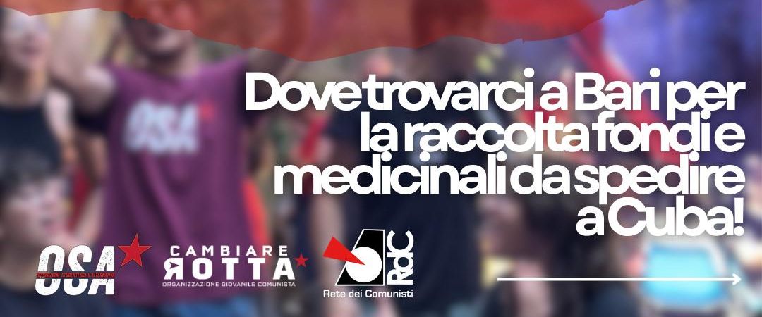 Dopo la chiamata generale fatta dalla Rete dei Comunisti, Cambiare Rotta e OSA per organizzare una campagna di solidarietà internazionalista concreta per Cuba, le tre organizzazioni a Bari hanno subito predisposto varie iniziative e punti di raccolta medicinali e fondi da inviare all’isola.